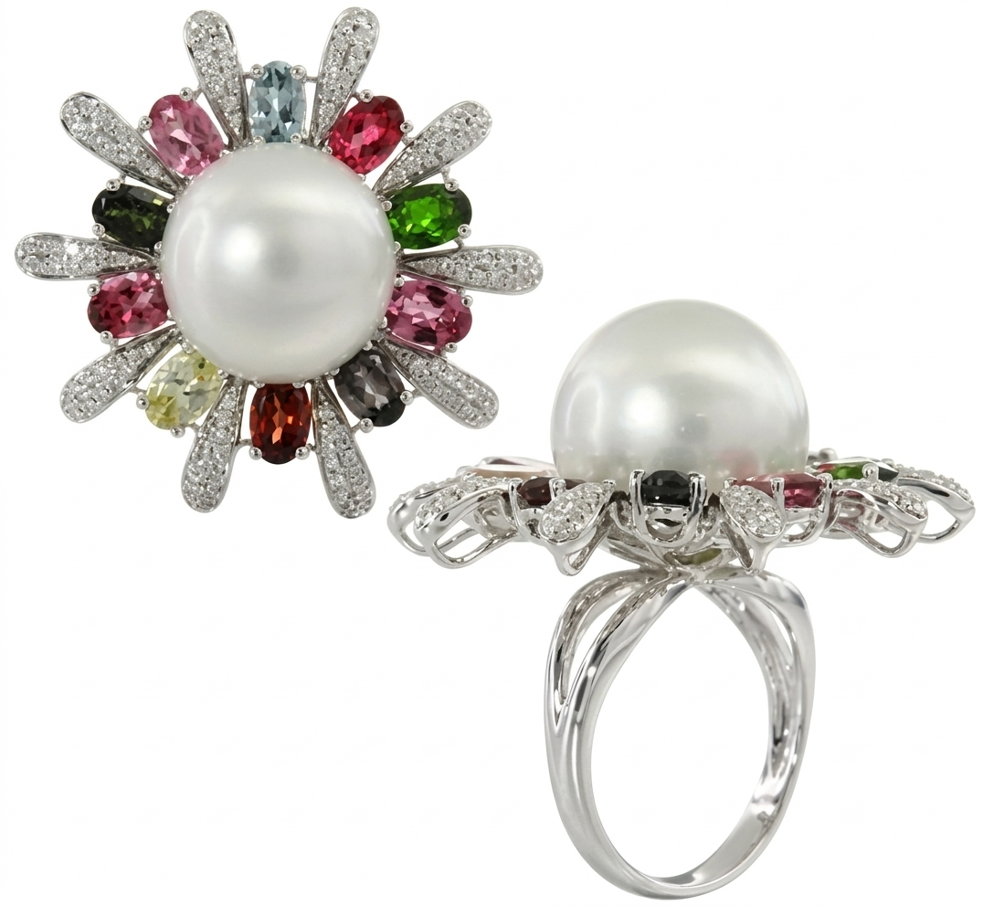 Elevate your elegance with this breathtaking Limited Edition ring from our Multicolor and Red Carpet Collections. Crafted in lustrous 14K white gold, the centerpiece features a magnificent 15mm round White South Sea pearl, renowned for its radiant luster and rarity. Surrounding the pearl, brilliant-cut diamonds sparkle alongside an array of vivid, multicolor tourmalines—each carefully selected to create a harmonious cascade of color. Sophisticated and bold, this one-of-a-kind ring embodies exceptional craftsmanship, making it an unforgettable statement piece for any special occasion. Discover the fusion of timeless luxury and artistic brilliance in this exclusive design.