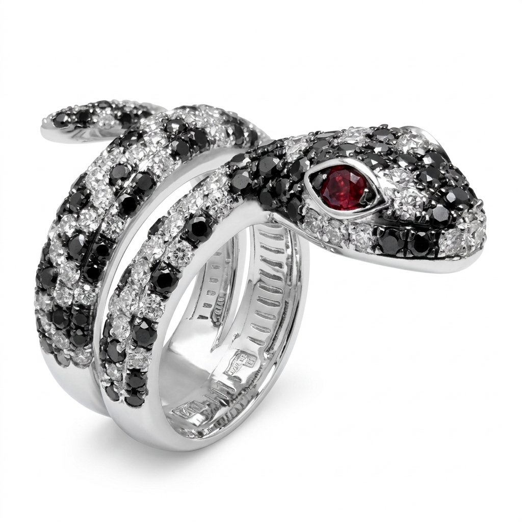 Embrace bold elegance with our 14K White Gold Snake Ring, an exquisite piece from our Limited Edition Ruby and Precious Birthstone Collections. This striking ring coils gracefully around the finger, expertly crafted in luxurious 14K white gold. Dazzling diamonds and treated black diamonds highlight the serpent’s curves, while vivid 2mm round rubies crown the design, infusing color and mystique. A symbol of transformation, wisdom, and passion, this limited edition statement ring is a mesmerizing tribute to refined style and the timeless allure of fine gemstones.